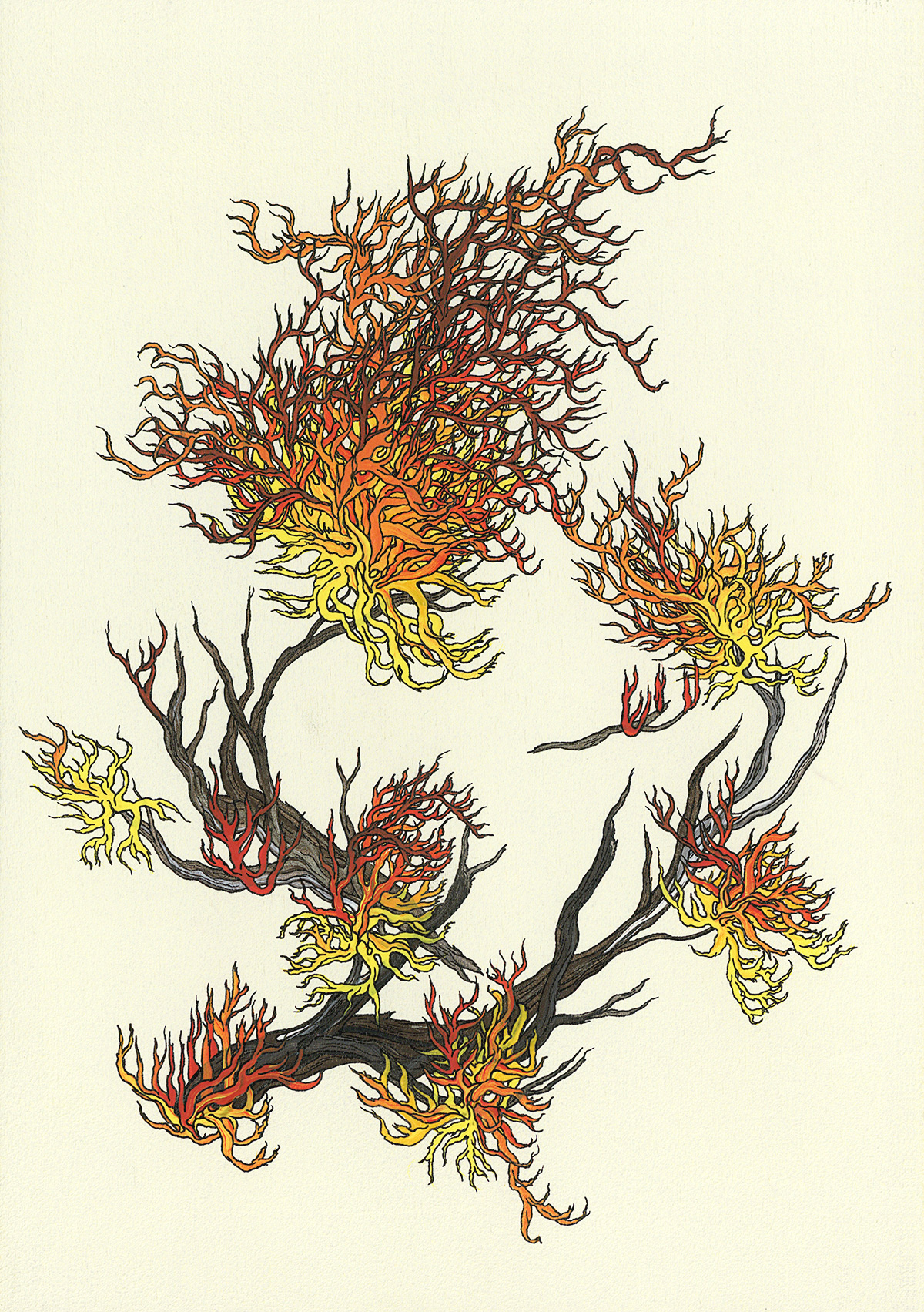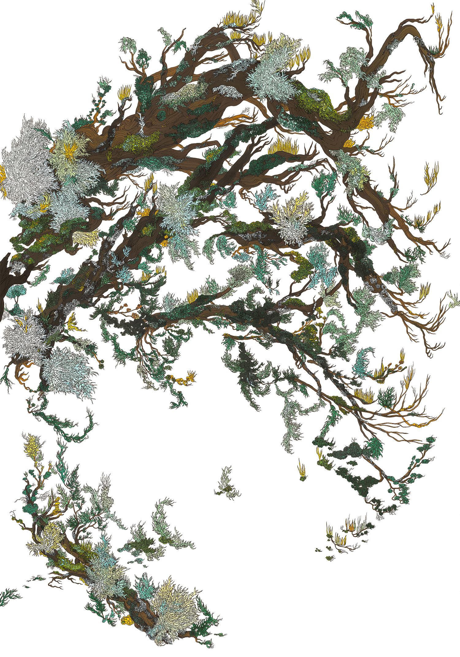 Les lichens me fascinent aussi car ils sont le résultat d’une symbiose entre une algue et un champignon. Cette idée de la vie en symbiose me renvoie à la pensée libertaire de Thoreau ou Reclus, aux réseaux d’entraide, au rêve de former des communautés riches de l’amitié et non compétitives.