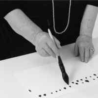 Pierrette Bloch utilise l’essence du dessin, son pouvoir d’esquisse et la suggestion de formes denses ou mobiles, qui ne sont jamais autoritaires ni tout é fait encloses. On pourrait dire qu’elle tient le journal du temps, de son temps, dès lors qu’elle s’assoie à sa table de travail, pose la pointe d’un pinceau gorgé d’encre sur le papier, propose ses petites virgules ou point, faits main, comme autant d’imprévus en lavis de noir jusqu’à la transparence...».