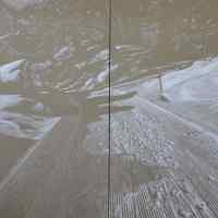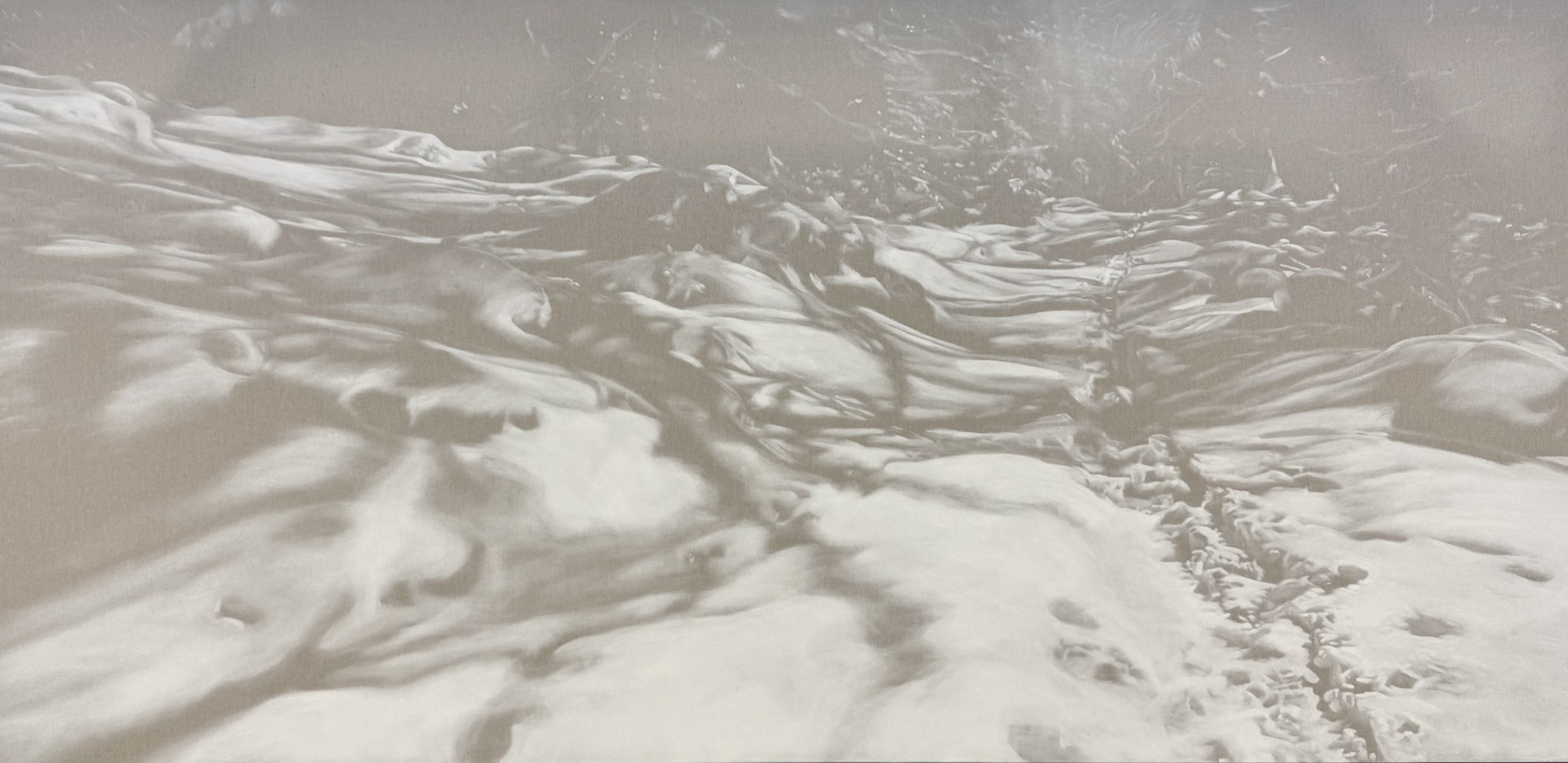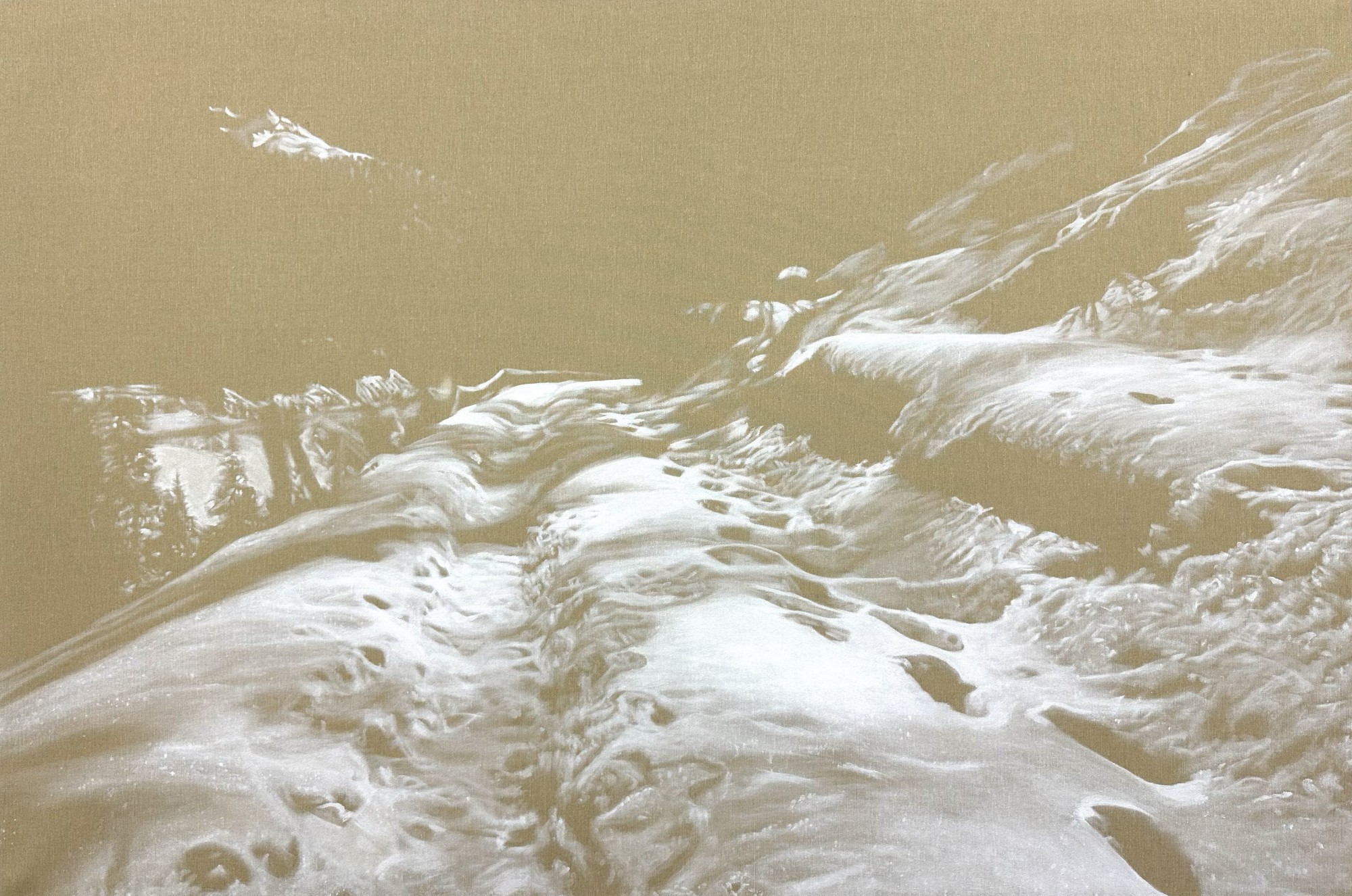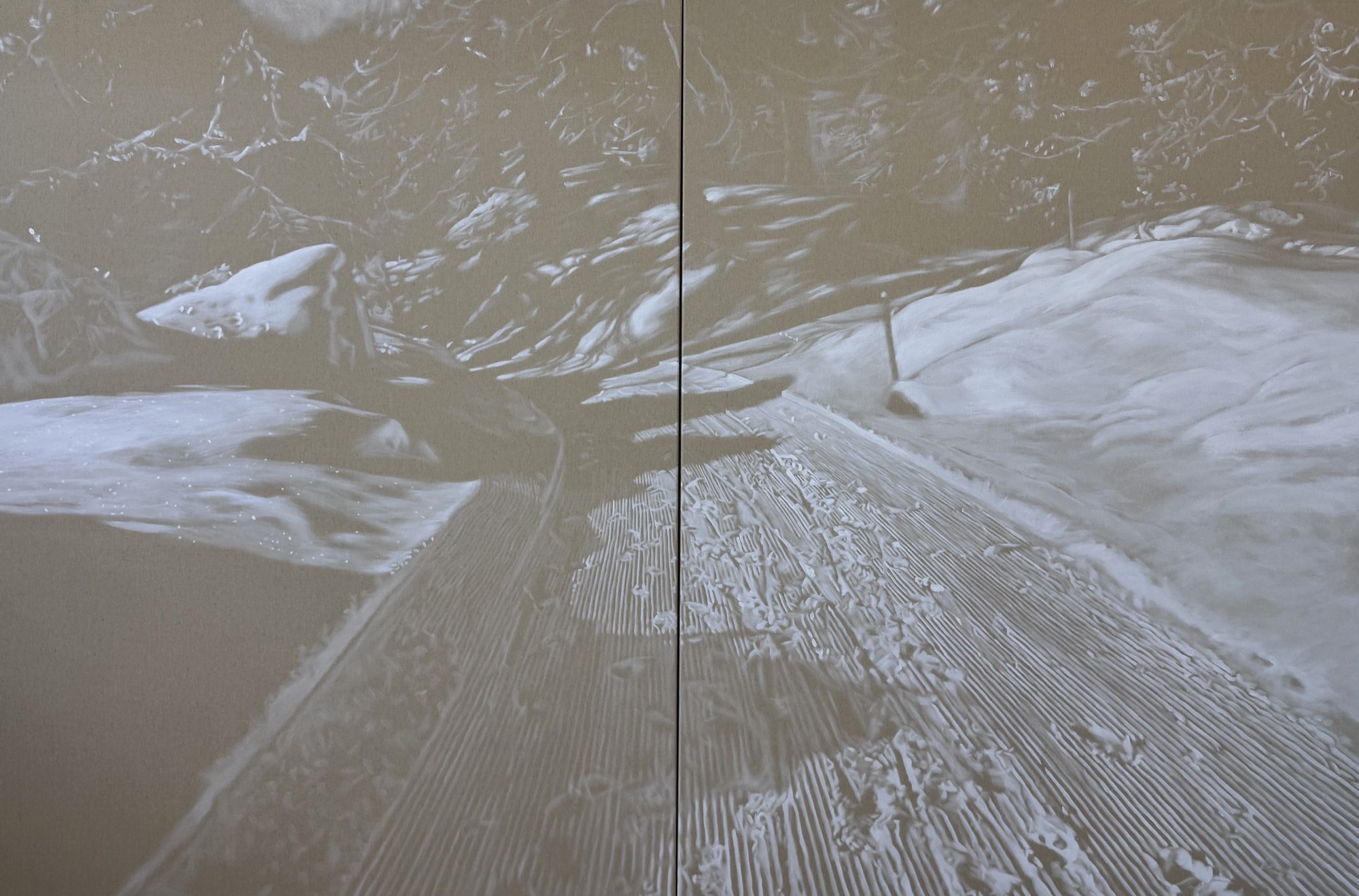 Avec “ Fastizis ”, elle devient épure, libérée de toute autre couleur, structurée dans un graphisme proche du dessin qui affirme pourtant la matière même de la neige et révèle les marques de la présence humaine.