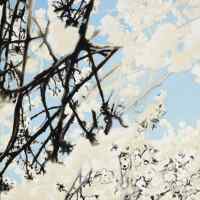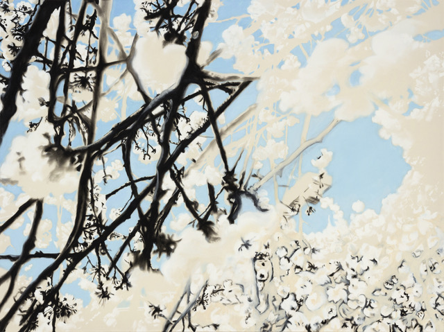 Devant le constat de cette « accélération », le besoin de printemps est crucial. Les toiles tirent leur force de ce moment printanier furtif dont il faut savoir profiter. « On ne voit pas deux fois le même cerisier, ni la même lune découpant un pin. Tout moment est dernier, parce qu’il est unique. Chez le voyageur cette perception s’aiguise par l’absence des routines fallacieusement rassurantes propres au sédentaire, qui font croire que l’existence pour un temps restera ce qu’elle est », pour reprendre les termes de Marguerite Yourcenar. Ladina Gaudenz s’appuie sur des photographies prises l’an dernier pour créer un bouquet de cerisiers qu’elle s’empressera de découvrir bientôt au Japon. Dans cette attente, elle s’approche du sujet à la manière d’un insecte et nous fait entrer dans des méandres de couleurs insoupçonnés : « J’aime ce genre de transformations où la nature prend une autre dimension devant nous.» Si le saut d’échelle avait déjà été pratiqué dans des compositions précédentes, le ton est moins surréaliste qu’il n’a pu l’être dans d’autres séries. Quant au traitement stylistique, il oscille entre le flouté d’avant 2007 et les lignes plus contrastées apparues ensuite. Comme si la nature amorçait des dynamiques nouvelles selon les flux d’une lumière traitée parfois jusqu’à l’éblouissement.