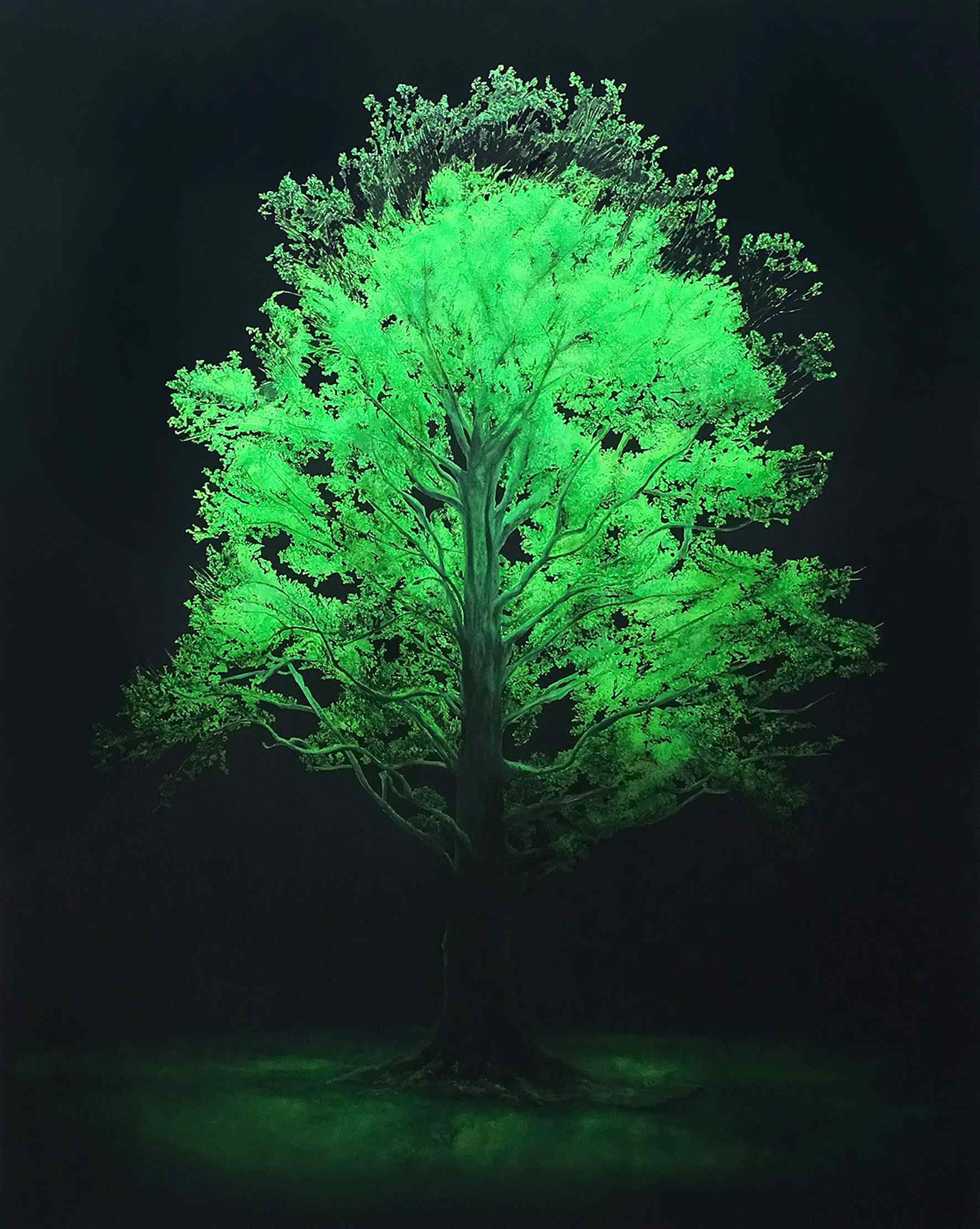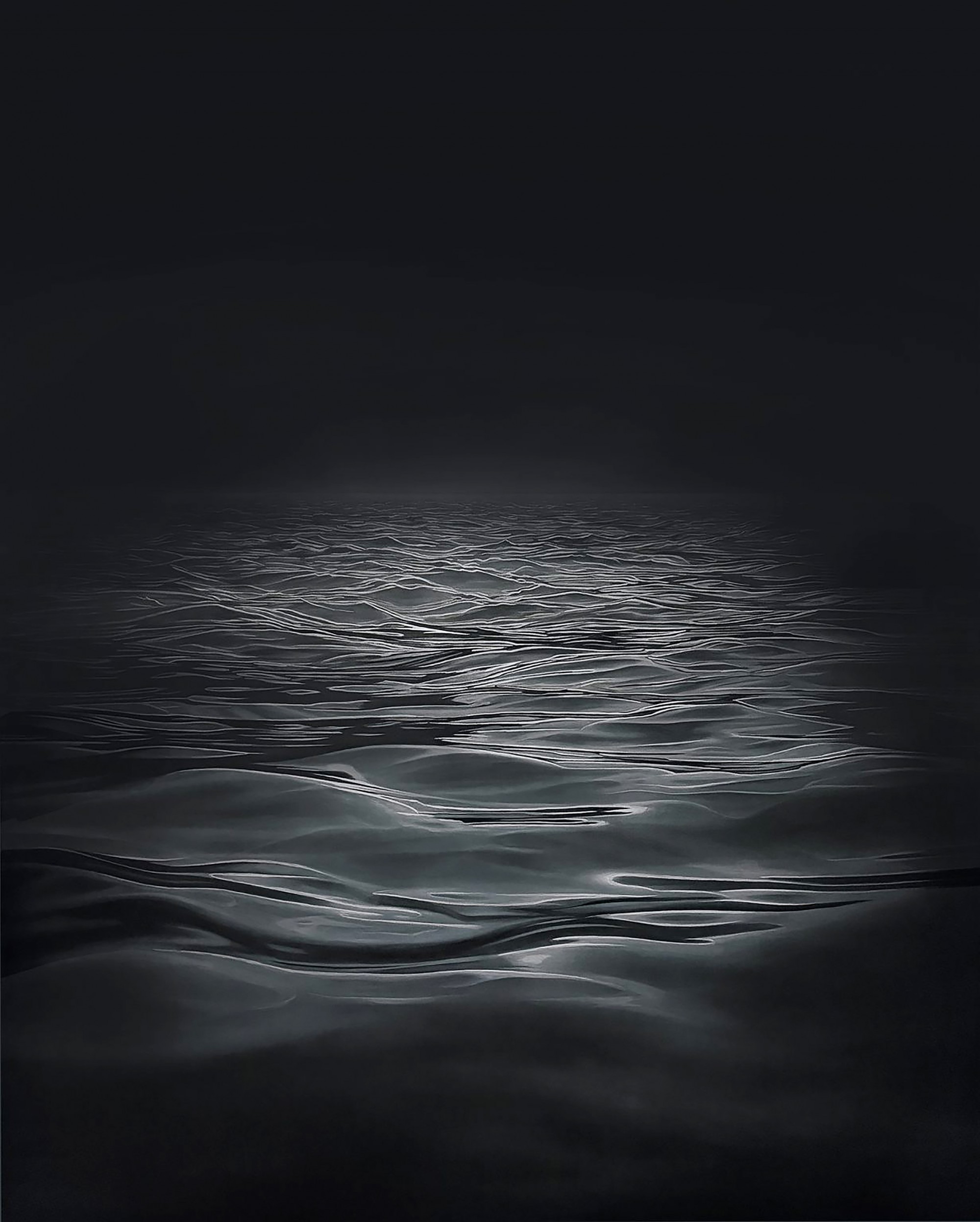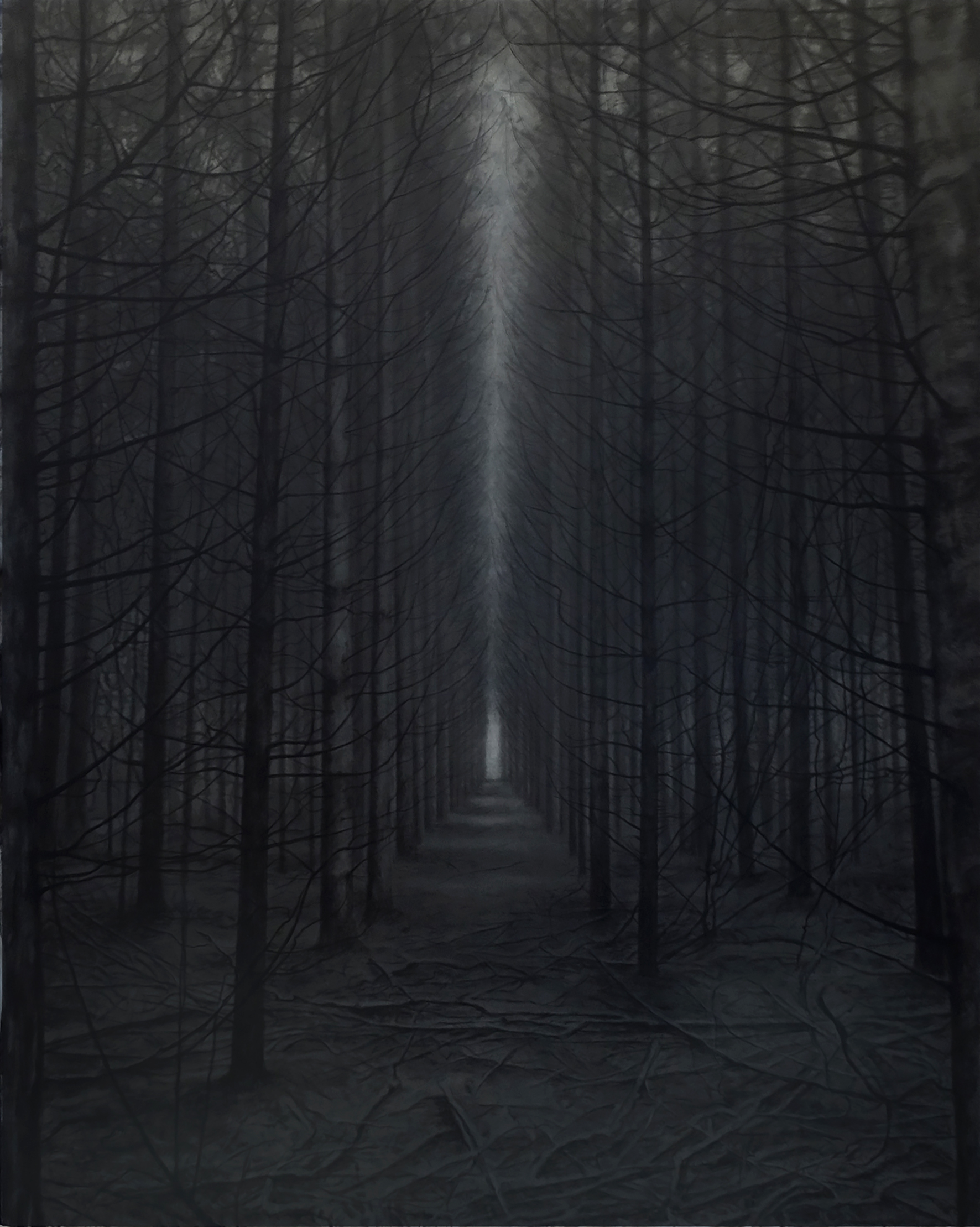 Ses peintures procèdent d’un processus long, presque alchimique : strates de glacis, ponçages successifs inspirés des techniques de carrossiers, vernis imperceptibles absorbent et restituent la lumière avec une précision millimétrée. Ce feuilletage, analogue à une photographie inversée, produit une vibration optique à la limite du discernable. Sous cette neutralité apparente s’inscrivent le temps du geste, la densité de la matière et la mémoire du regard. Les séries récentes de forêts — The Queens — explorent la nuit comme territoire sensible et mémoriel. Ces paysages réinventés, nés de réminiscences visuelles et sensorielles, se construisent moins dans l’observation que dans la remémoration. On y retrouve le regard de Julien Gracq (Lettrines II, Paris, José Corti, 1974), pour qui le paysage n’est jamais spectacle mais apparition différée mais une reconnaissance lente et progressive du monde. Dans la pénombre de ses toiles, le spectateur est invité à un état d’attention suspendue, où la peinture cesse d’être un objet pour devenir un lieu mental et respirant, habité par la durée et la temporalité.