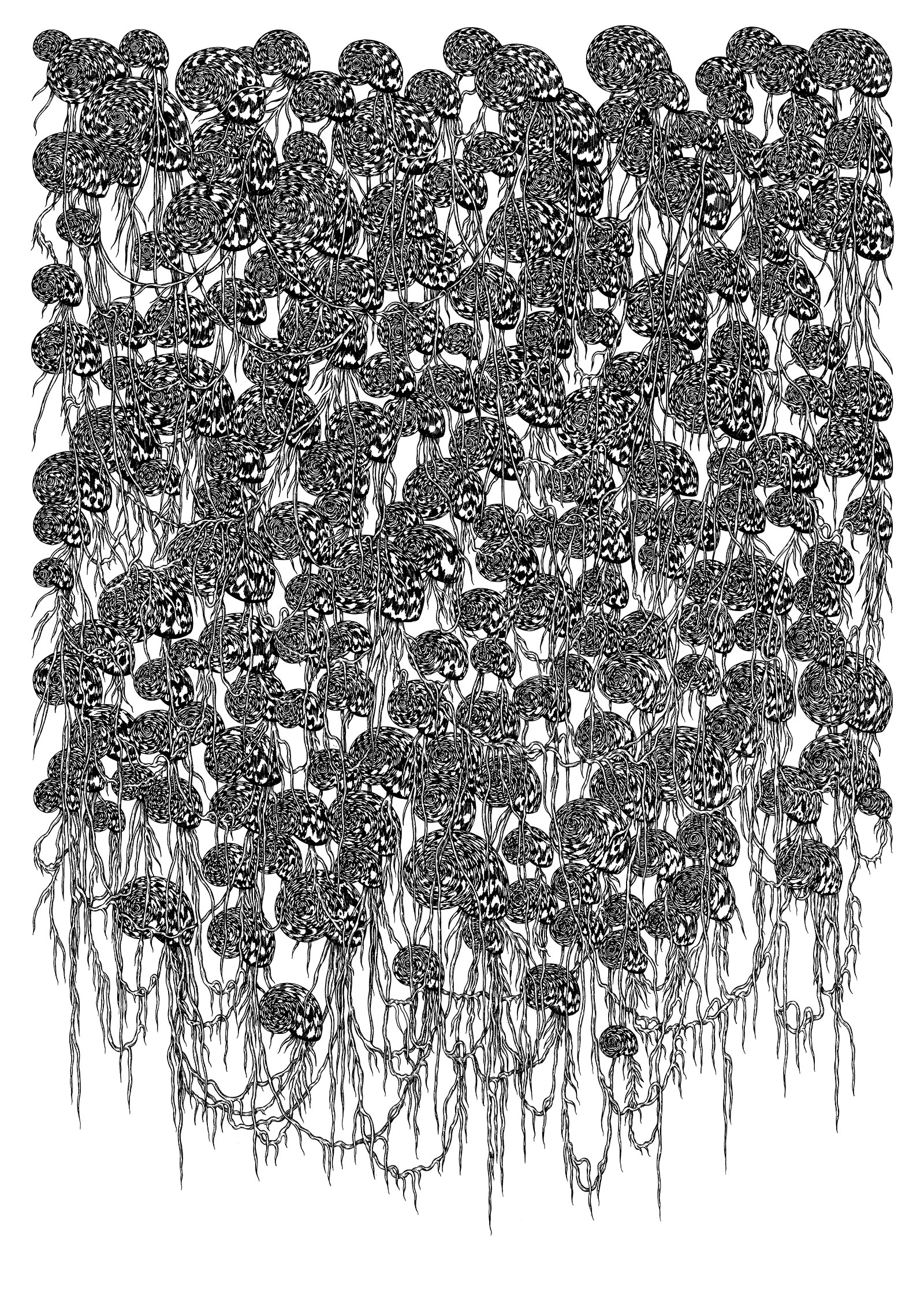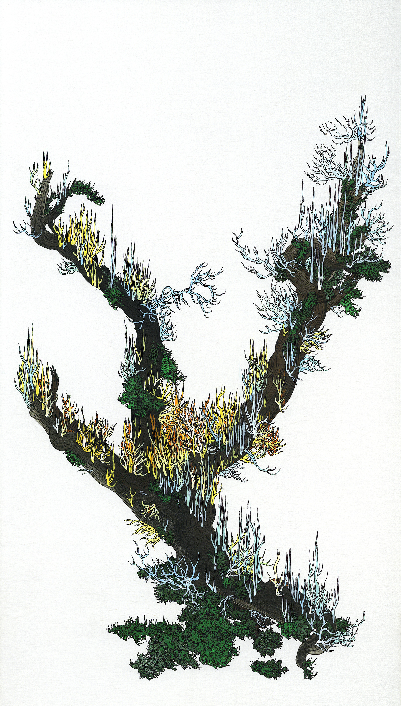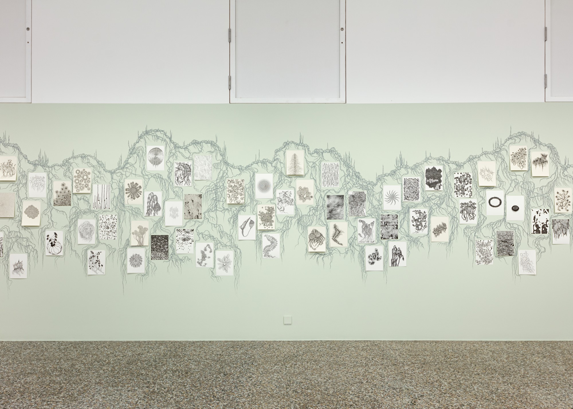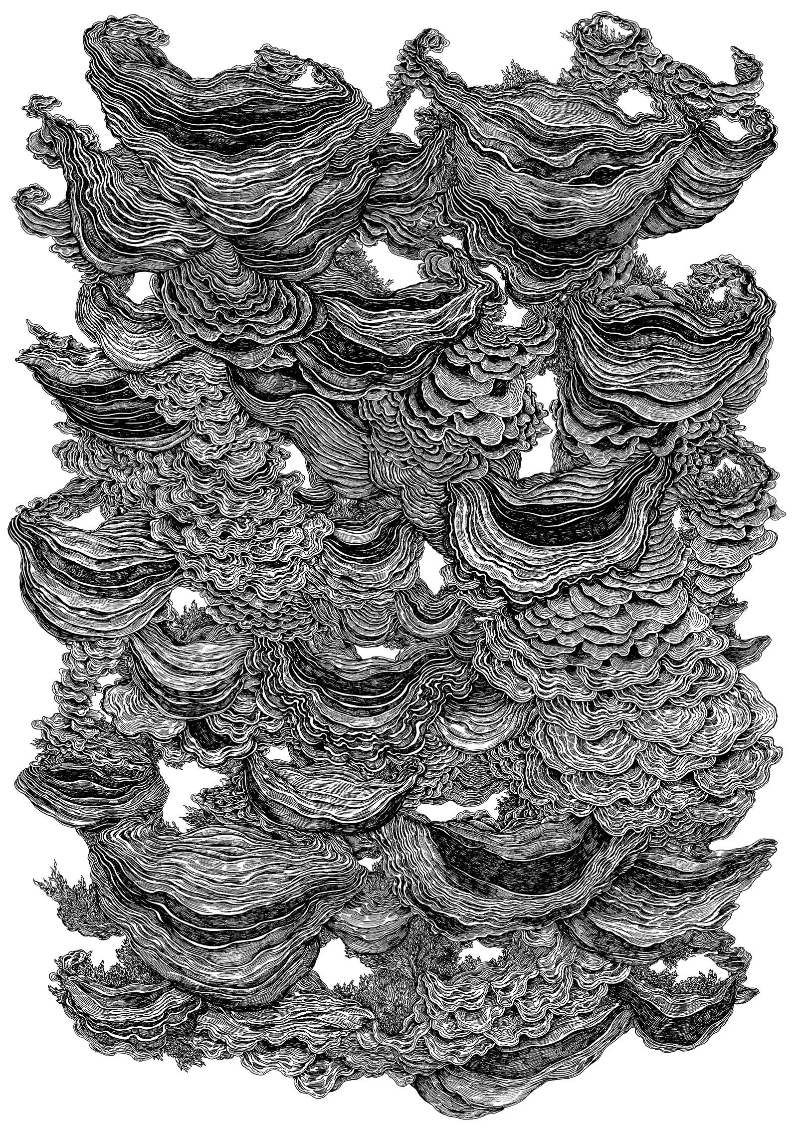 Ma source d’inspiration première est mon environnement proche, le jardin, la forêt. La dimension du proche, du petit, de l’accessible – c’est là ou je peux aller à pied. Dans ces lieux je vadrouille, je contemple, je m’attarde sur les détails des écorces, des mousses, des lichens et champignons, des fleurs de bord de chemin, des insectes. Je me fais discrète, je ne suis pas seule. Je ne prélève rien ou presque rien, j’emporte des souvenirs, des sensations, des émotions et des images qui flottent, se déforment, muent, et parfois se transforment en obsession. La série La vie du bois mort me vient d’une de ces vadrouilles de laquelle je suis rentrée avec l’idée fixe de dessiner une souche qui grouille de vie.