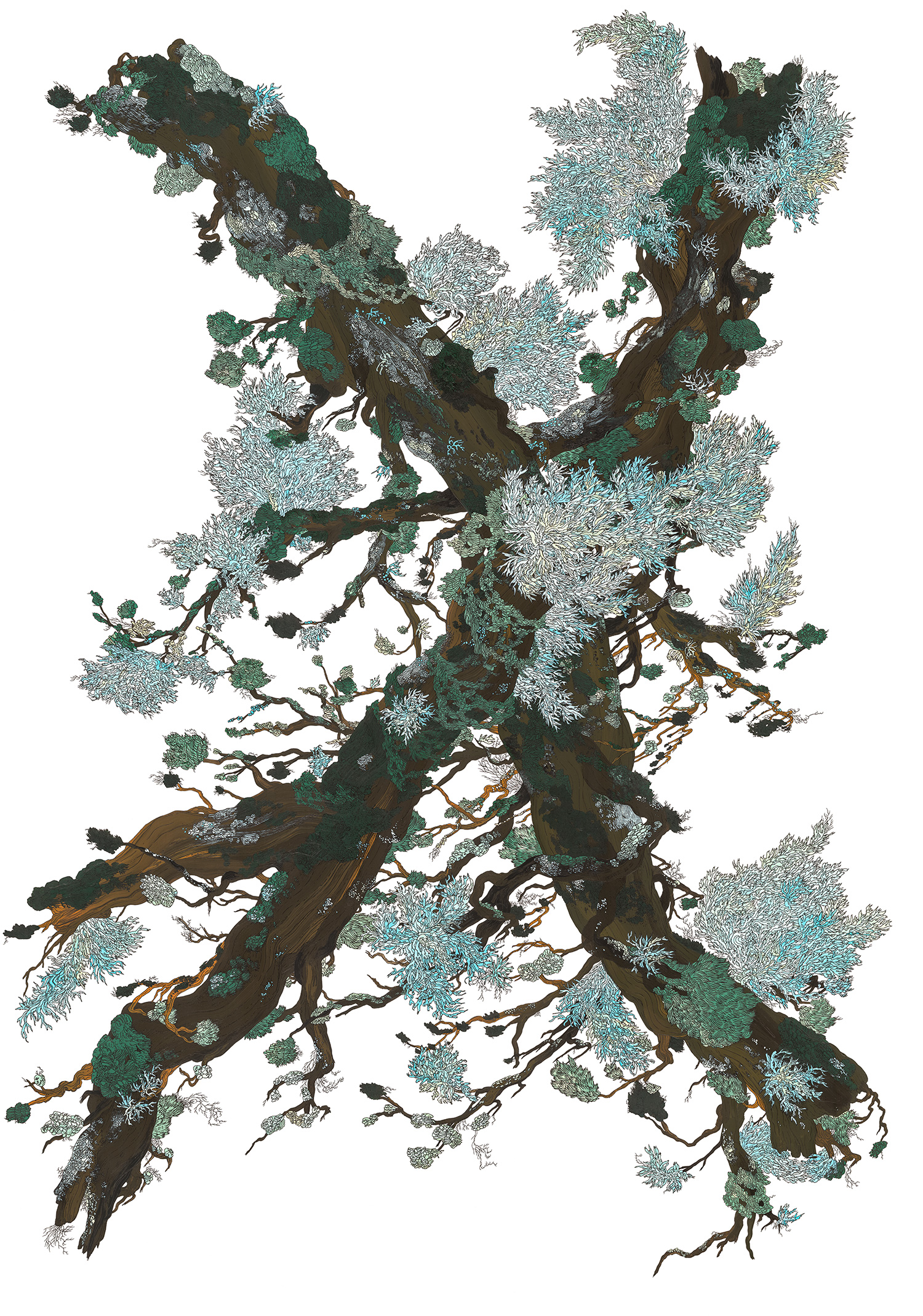 Les lichens me fascinent aussi car ils sont le résultat d’une symbiose entre une algue et un champignon. Cette idée de la vie en symbiose me renvoie à la pensée libertaire de Thoreau ou Reclus, aux réseaux d’entraide, au rêve de former des communautés riches de l’amitié et non compétitives.