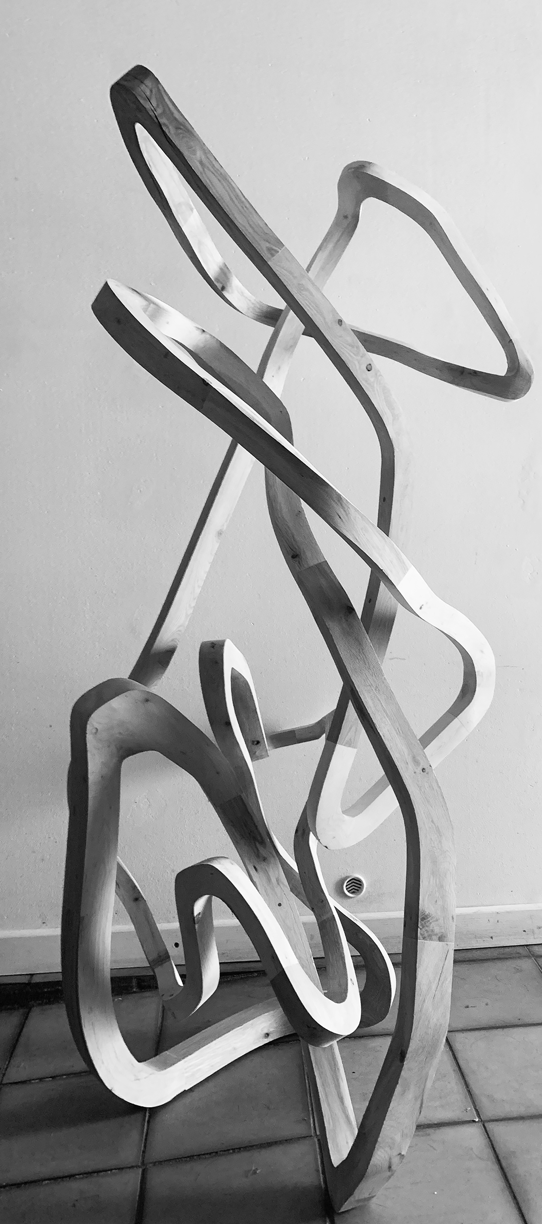 « C’est un double jeu: j’interviens et je me laisse guider », un dialogue infini et fertile entre la nature qui propose et l’artiste qui recompose. Le bois, Laurent de Pury en a depuis trente ans et plus fait son matériau d’élection et son inépuisable champ d’exploration. Et « je ne suis pas encore sorti du bois... » sourit le sculpteur qui a vécu ses douze premières années au Cameroun, où l’exubérance végétale de la forêt primaire et le tissu de contes et légendes qui lui est lié l’ont marqué au plus profond. Mais pas trace d’inspiration ethnique ou primitiviste dans son travail pour autant. C’est un lien très fort qui l’unit aux arbres, atavique, presque organique et plein de respect. Mais il en tire son langage personnel, ses souples géométries, ses élans verticaux, ses rubans sans fin, ses entrelacs, ses écriture sans paroles, ses lignes épurées qui dessinent et architecturent l’espace. Si le foisonnement immersif de la forêt le ressource et l’inspire, le désert ne le fascine pas moins avec son ascèse et son vide magnifique. Pleins et vides sont aussi les grands acteurs de sa sculpture. Le vide surtout qui s’y taille la plus grande part, émaciant les volumes jusqu’à la ligne. Car comme en musique où le son n’existe que par rapport au silence, c’est le vide qui vient donner leur sens et leur tension à ses tracés.
