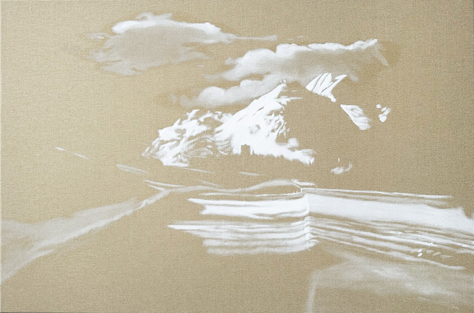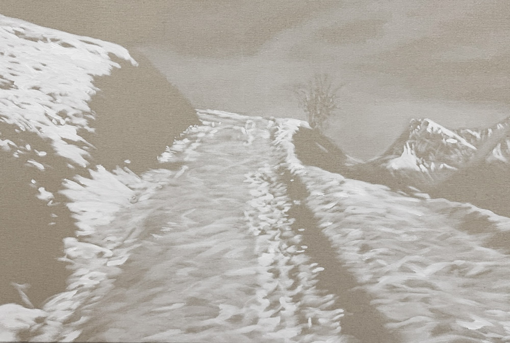 La technique développée fait apparaître la toile de lin brute, le vide, en tant que sujet et le trait comme expression de l’essentiel du paysage. Une seule couleur est utilisée : la peinture à l’huile blanche dont la puissance devient lumière. Cette façon de peindre est un renversement des valeurs, le sombre étant traité comme une force narrative non peinte.