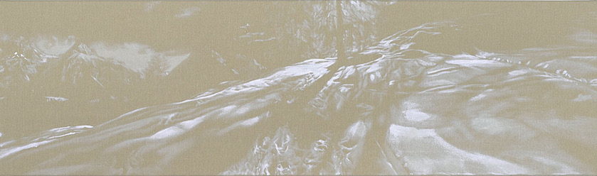 Est-on encore dans le figuratif ou déjà dans l'abstrait ? L'important n'est pas là. Car si la peinture de Ladina se fait parfois plus abstraite, elle l'est ici au sens étymologique fort de abs-tracta, c'est-à-dire tirée de. De près comme de loin, c'est toujours de la nature que sa peinture est tirée. Comme chez le grand Gerhard Richter, le rapport au monde demeure la clé de voûte de l'oeuvre, fût-il une illusion, un simulacre flou, indécis et changeant. En écho au mystère du réel à jamais insaisissable, la peinture s'invente une autre réalité qui lui est propre, une réalité artistique. Dans ses lacs grisons, le paysage se livre et se médite à travers ses reflets. La vision bascule, le regard s'inverse et s'affole, aspiré jusqu'au vertige « De l'autre côté du miroir ».