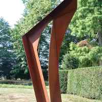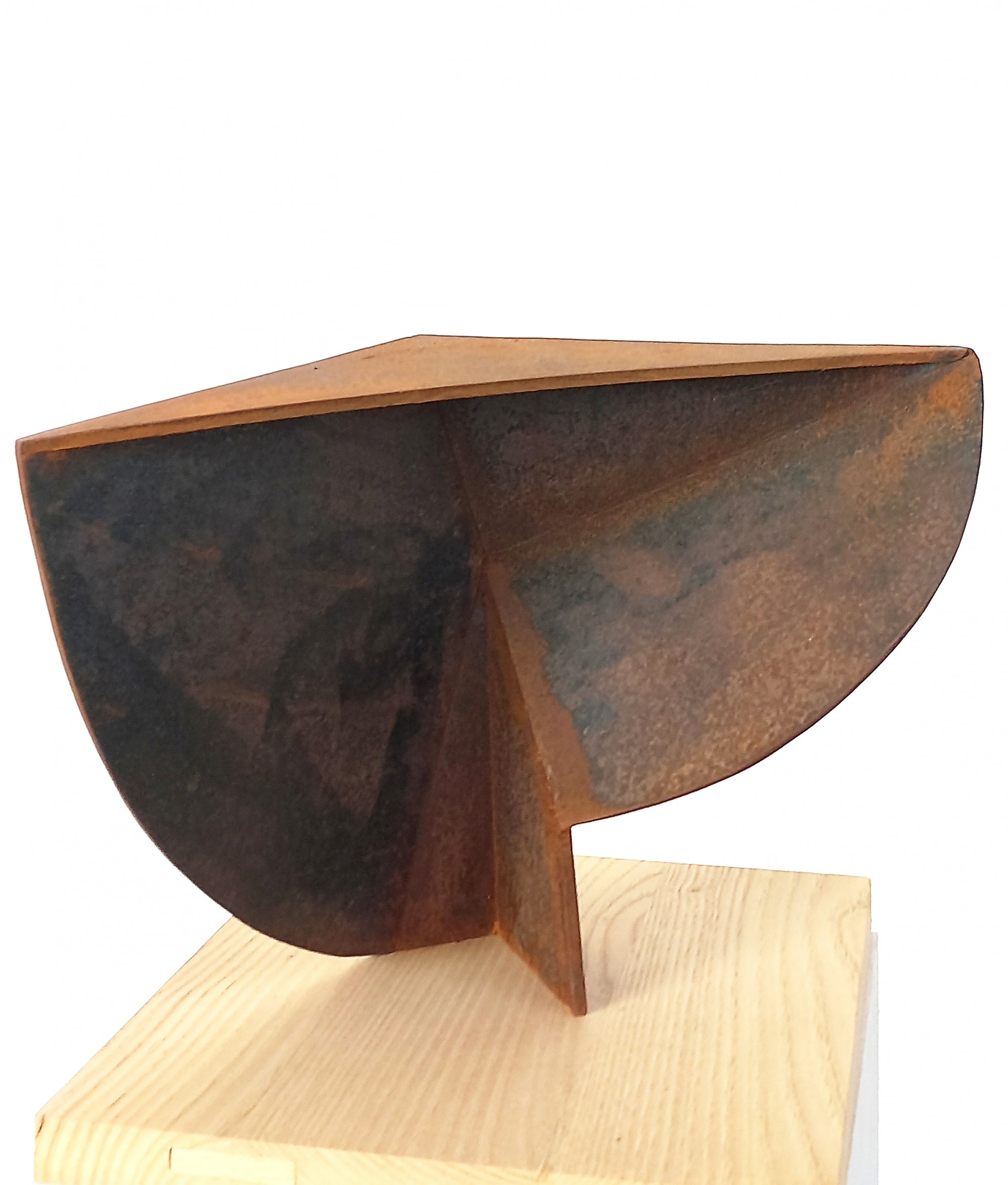 L’angle ou le pli? Dans une sculpture de Jean-Patrice Rozand, la jonction de deux plans (soudés) nous apparaît souvent comme un pli. Le pli n’est pas une ride ou une déchirure, n’est pas une crispation ou un sourire. Le pli est dessin, définition, limite: rectitude de la pensée. Il marque l’arrêt d’un plan, une butée de la lumière. Aussi, en tant qu’il fait angle, il instaure la justesse des proportions et le partage exact de l’ombre.